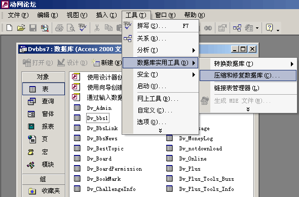 选择工具--数据库实用工具--压缩和修复数据库--[改回.asp的扩展名]--上传覆盖原来数据库文件(如下图)